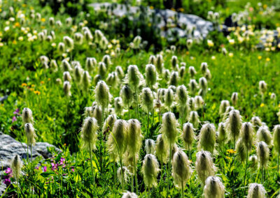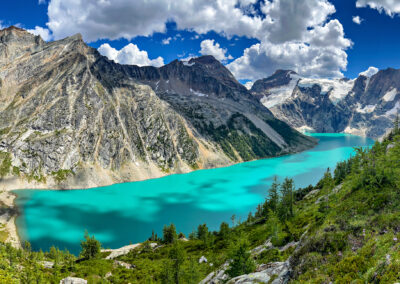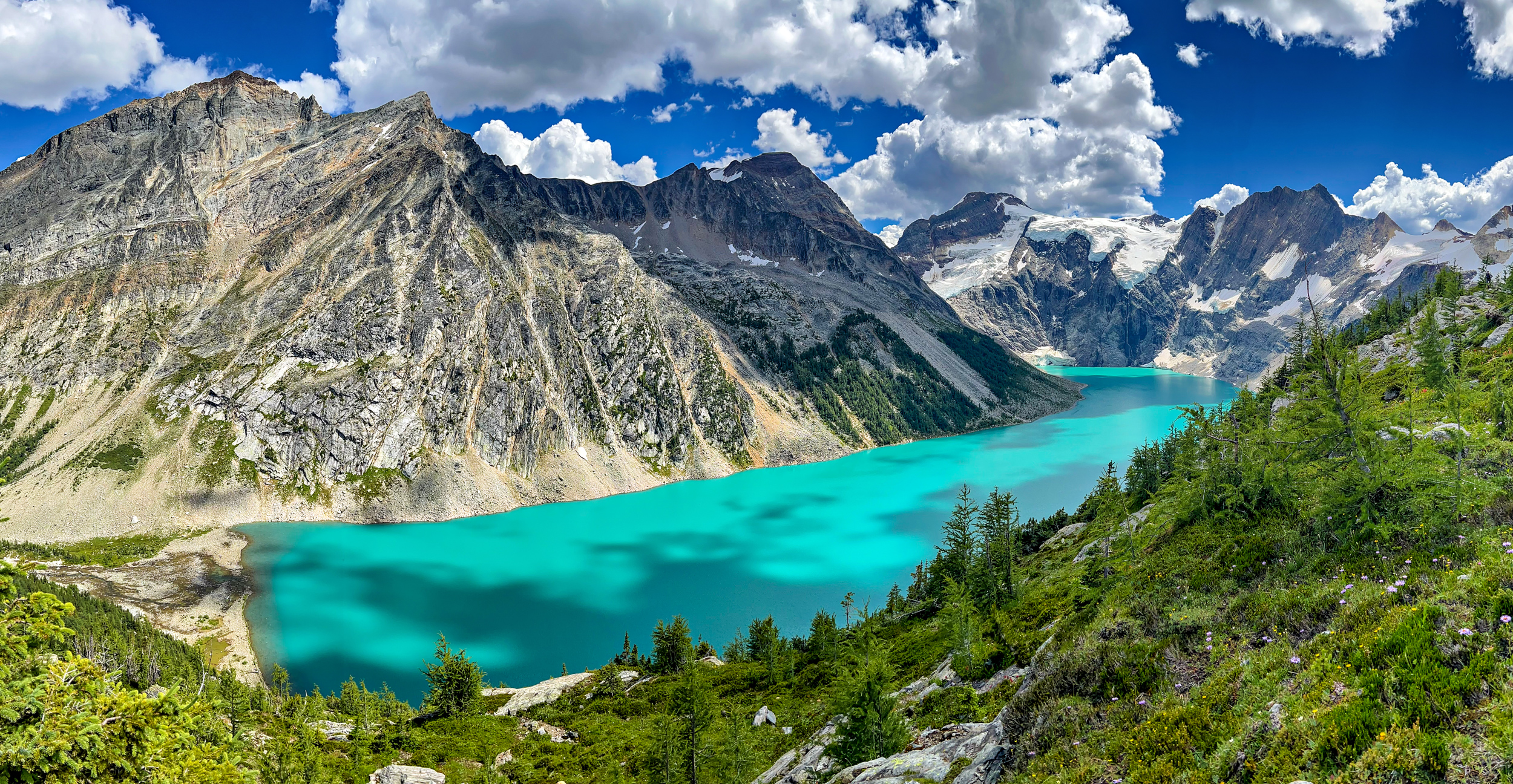 The trail starts by following a gentle grade along the north side of Horsethief Creek. The trail swings away from the creek at 1.8 km climbing through the forest until you reach the turbulent Hell Roaring Creek. Plunge back into the forest on the other side of the creek for another 1 km before reaching the new permanent aluminum bridge supplied by Recreation Sites and Trails BC. From here the trail climbs steeply through the forest beside Horsethief Creek. Don’t count on intimate conversation with your partner on this portion, as you climb higher the creek turns into a raging torrent. The trail is shaded and cool on those hot summer days and there are several great viewpoints, an opportunity to catch your breath and enjoy the cool mist coming off the creek. This stretch is one of the highlights of the hike, the creek at this point looks like a kilometre long waterfall as it rushes down the mountain. As you veer away from the creek, the noise recedes into the background and the solitude of the forest returns. A steady climb takes you over avalanche slopes and a couple of two-log bridges. Eventually the trail emerges from the forest with views of a cascading waterfall coming from the lake. Make sure you have your camera handy for some shots of the always curious marmots lazing around the rocks. The real reward is just over the ridge. Be prepared to have your breath taken away, as you get your first glimpse of the mountains and glaciers that flank this spectacular lake. You will want to spend some time at the lake. It’s the perfect spot to stop for lunch with a backdrop of ice floes, glaciers and snow-capped mountains If you want a close-up view of the glacier, hike over rocky terrain on the east side of the lake. There is no trail.